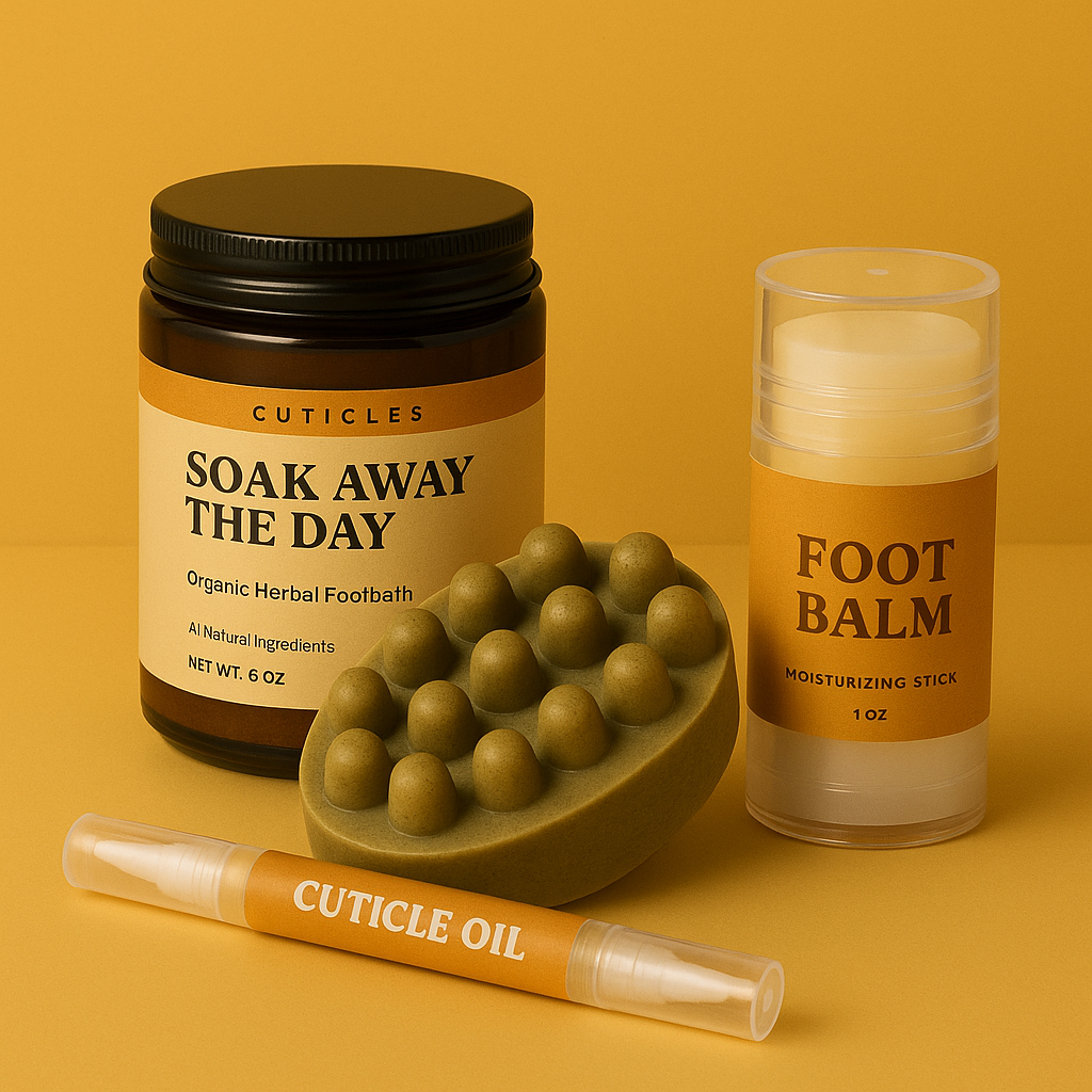 The full foot care lineup- SCRUB, SOAK, BALM, and QUTICLE OIL PEN. Made to give your feet the love they deserve.